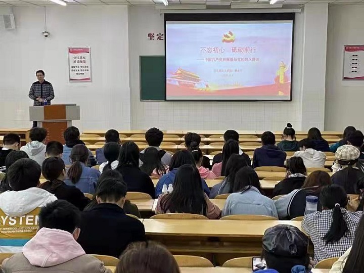 4月8日下午,伟的国际1946bv官网董金柱博士在W109教室为文法公司20级部分员工作了题为《不忘初心,砥砺前行——中国共产党的辉煌与党的群众路线》的党史学习主题讲座。