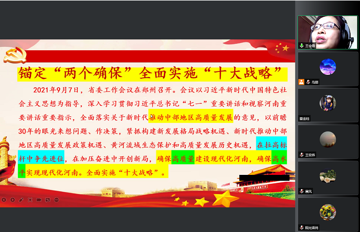 会上,第二党支部王会霞老师结合自身近几年来从事河南省人才强省战略研究成果,做了题为《学习贯彻河南省“十四五”人才发展人力资源开发和就业促进规划 锚定“两个确保”全面实施人才强省战略》的专题讲座。王会霞从三个方面进行了阐述:一是人才的内涵与国家的人才强国战略,二是从发展基础、面临形势、“十四五”时期要实现的目标、举措四个方面如何学习贯彻河南省“十四五”人才发展人力资源开发和就业促进规划,三是人才强省战略要处理好的各类教育资源均衡、民众关注的重点、顶层设计与摸着石头过河的统一、目标设定与落实相统一四个问题。