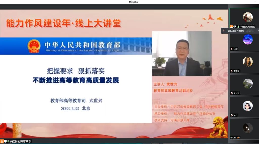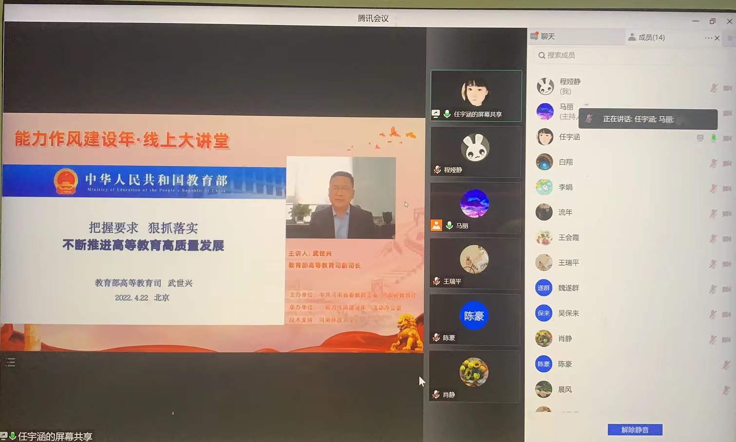 2022年4月28日下午,公司党总支第一、第二、第三党支部通过腾讯会议组织全体党员教师在线集中学习教育部高等教育司副司长武世兴主讲的《把握要求 狠抓落实 不断推进高等教育高质量发展》的报告。郭霞副经理、第二党支部书记任宇涵、第三党支部书记李鲲鹏分别主持学习活动。