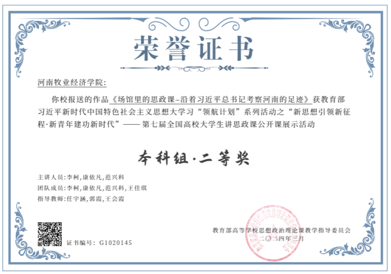 近日,由教育部高校思想政治理论课教学指导委员会主办的“新思想引领新征程·新青年建功新时代”——第七届全国高校老员工讲思政课公开课展示活动评选结果揭晓,由公司党委宣传部、伟的国际1946bv官网选送,伟的国际1946bv官网任宇涵、郭霞、王会霞老师指导,旅游公司和外国语公司员工李柯、康依凡、范兴科、王佳琪主讲的作品《场馆里的思政课——沿着习近平总书记考察河南的足迹》荣获本科组全国二等奖。