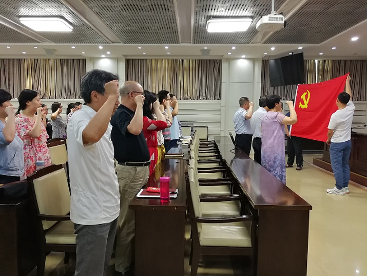 下午两点半,在党总支党员大会上,在党总支书记王本聚的带领下,全体党员举起右拳,面对鲜红的党旗,重温入党誓词,表达了为共产主义事业奋斗终身的决心。