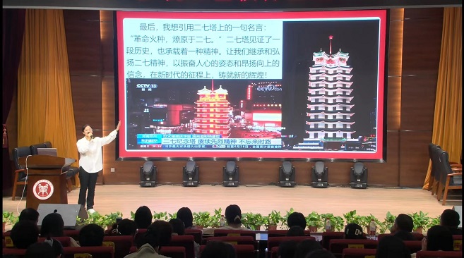 活动播放了上学期参观二七纪念馆主题演讲分校区决赛的宣传片。然后,由来自英才校区22国教物流04班的张佳琳、22国教营销02班的卢诣、龙子湖校区22园林02班的吕馨、22大数据(卡洛理工)01班的丁宁,北林校区22数媒07班的马春燕五位特等奖获得者,分别做了《二七大罢工纪念塔》《用我一世烟火 换你人间繁华》《感悟百年二七历史 弘扬永恒二七精神》《纪念二七百年 赓续红色血脉》《郑州二七纪念塔》的主题演讲。五位特等奖员工的成果展示,课件内容充实、设计新颖、详略得当、画面美观,讲解主题鲜明、思路清晰、仪态大方、感情饱满,引起观众强烈的情感共鸣。思想道德与法治教研室的五位老师一一进行了点评。随后,与会领导和老师为获奖同学颁发了荣誉证书。