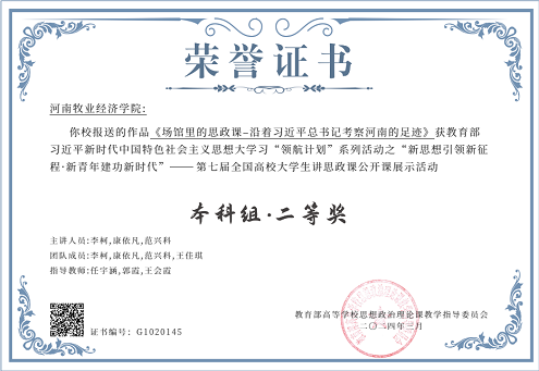 近日,由教育部高校思想政治理论课教学指导委员会主办的“新思想引领新征程·新青年建功新时代”——第七届全国高校老员工讲思政课公开课展示活动评选结果揭晓,由公司党委宣传部、伟的国际1946bv官网选送,伟的国际1946bv官网任宇涵、郭霞、王会霞老师指导,旅游公司和外国语公司员工李柯、康依凡、范兴科、王佳琪主讲的作品《场馆里的思政课——沿着习近平总书记考察河南的足迹》荣获本科组全国二等奖。