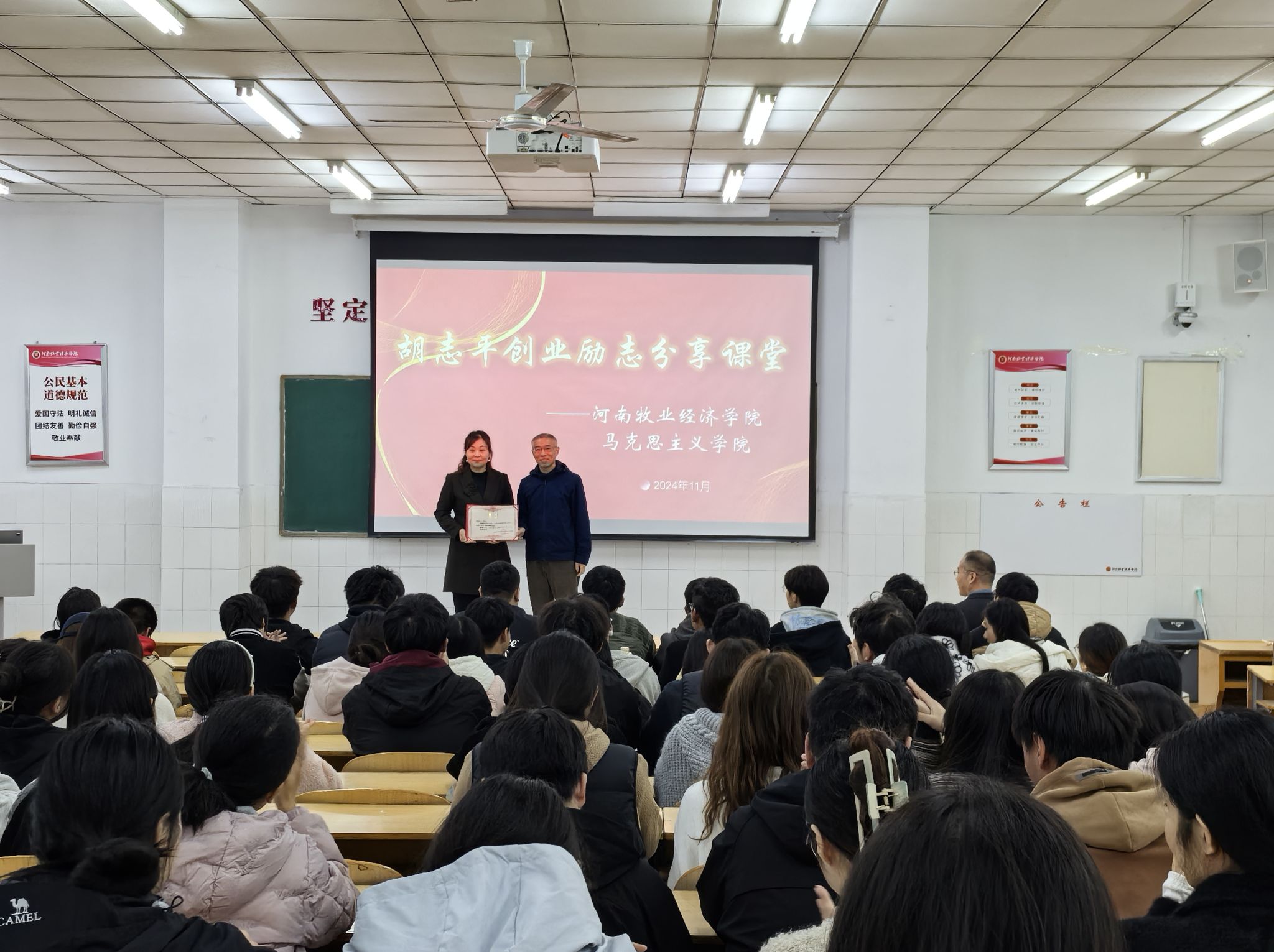 11月14日下午,伟的国际1946bv官网习近平新时代中国特色社会主义思想概论教研室邀请郑州赏渔火锅餐饮有限公司总经理胡志平在英才校区W109教室为国教会计专业和会计(ACCA)专业的员工做创业励志报告。伟的国际1946bv官网副经理吴保来博士、办公室主任马丽老师参加了报告会。报告会由习近平新时代中国特色社会主义思想概论教研室主任李志伟博士。